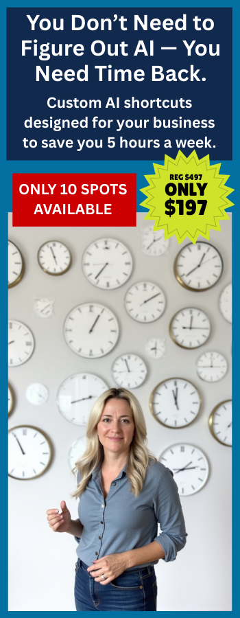 This is a focused, 30-day, done-for-you service where I take the tasks that are currently eating your time and turn them into simple AI-powered systems for you. No course to watch, no tech rabbit holes, no sorting through tools — you bring your real business tasks, I bring the AI expertise. Together we’ll briefly confirm where your time is going, and then I’ll design and refine a custom workflow that conservatively saves you at least 5 hours every week, backed by a full refund guarantee.